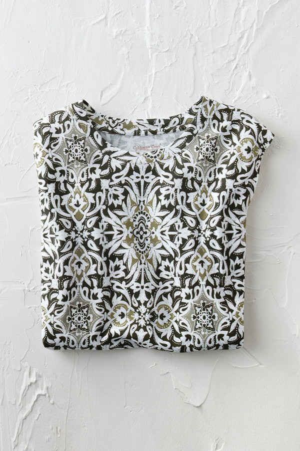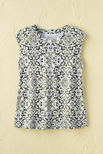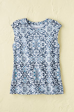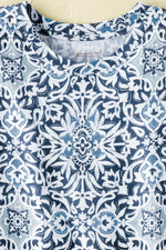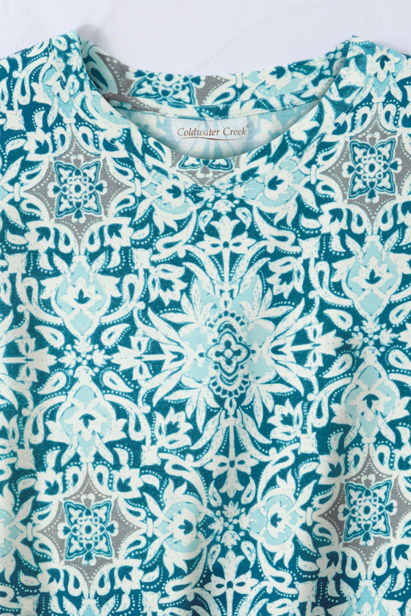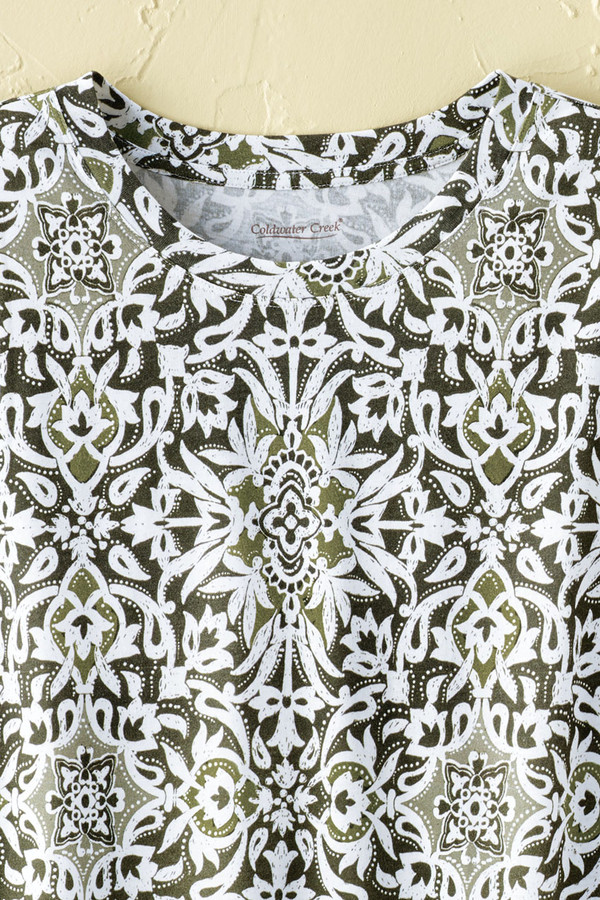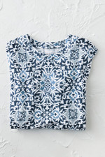 So easy to wear and pair, all summer long – with a medallion print, complemented by a comfortable, slightly boxy silhouette. Lightweight knit with extended shoulders. Imported.