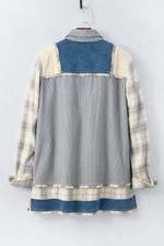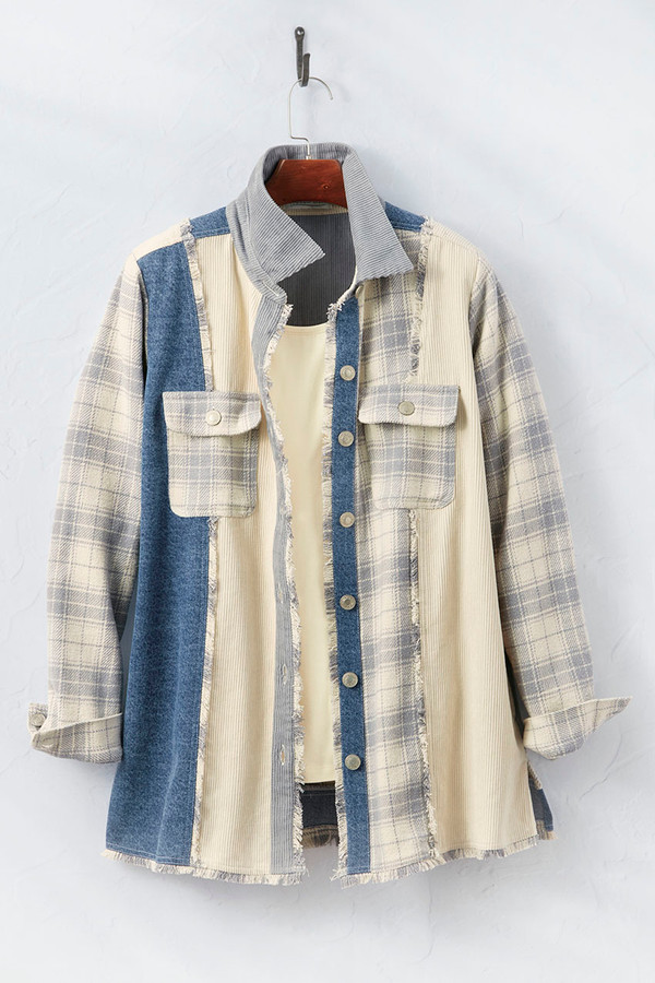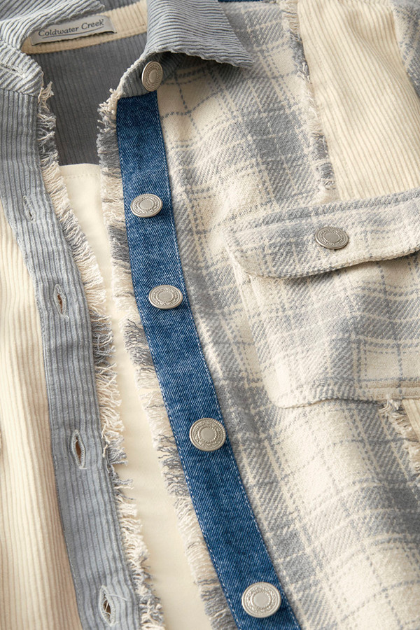 Artisanal style with a well-traveled vibe. This fun big shirt mixes corduroy, denim and flannel in a medley of textures and patterns, pulled together with frayed seams for a rustic feel. Perfect to wear alone or layered over a tee or tank. Side-seam and chest patch pockets, long button-cuff sleeves. Unlined.