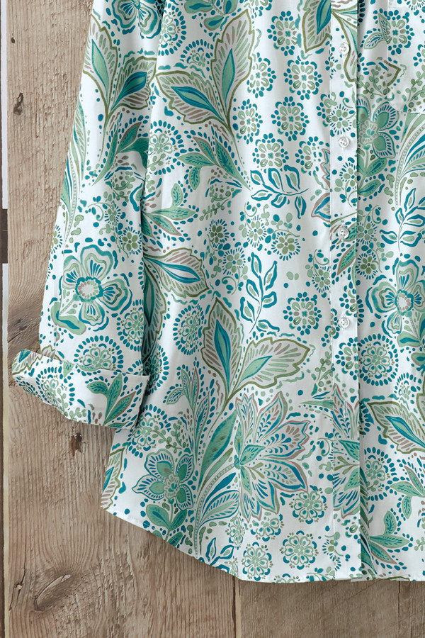 This no-iron cotton tunic is ready when you are, featuring a batik print of lavish leaves and florets. The wrinkle-free fabric ensures easy care and a fresh look all day, while the longer length adds a slimming line and flattering coverage. Long button-cuff sleeves, a single chest pocket, and curved side-slit hem complete the versatile design. Perfect over leggings, jeans, or comfortable pants.