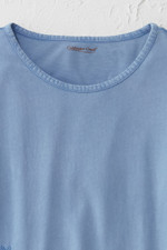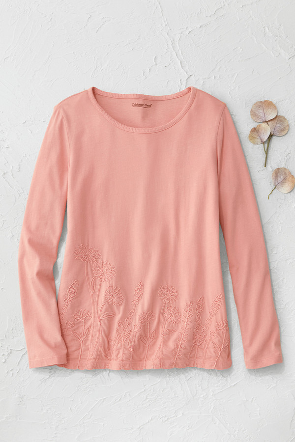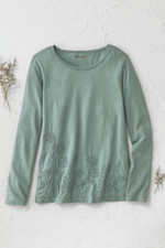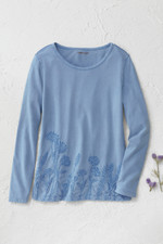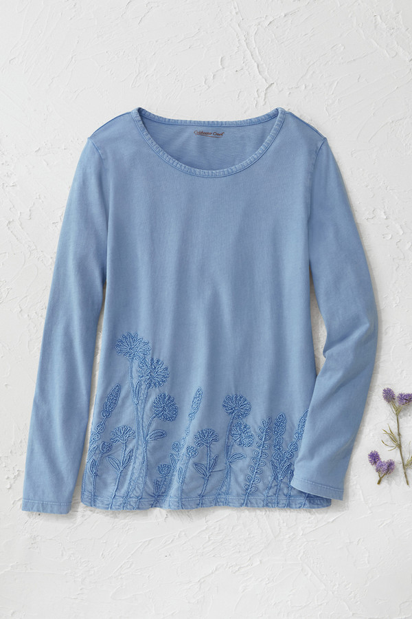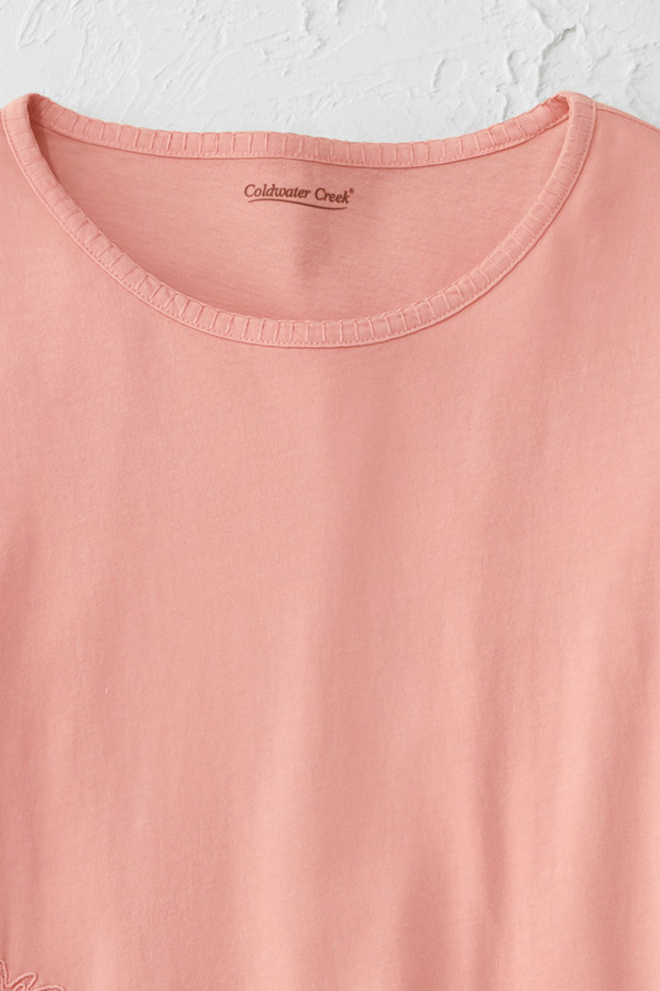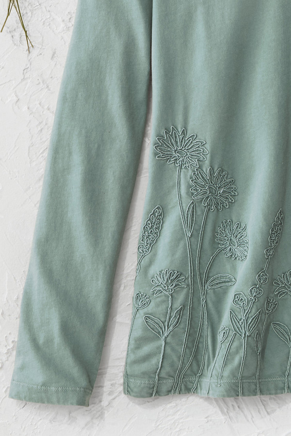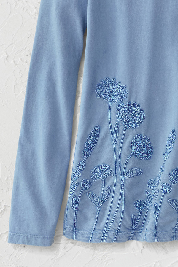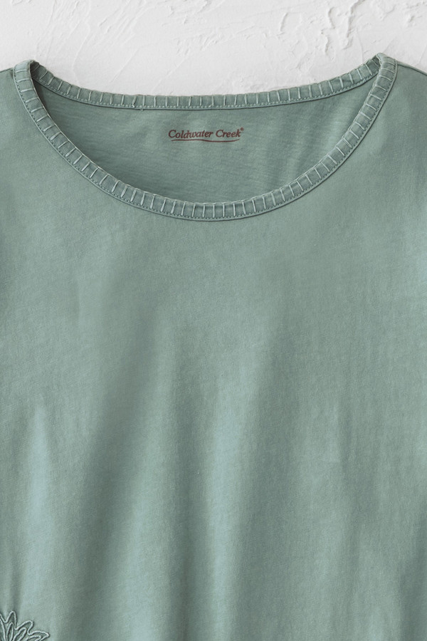 This lightweight cotton tee features tonal floral embroidery along the front hem with blanket stitch accents at the neckline and cuffs. The soft fabric and curved hem with side slits create comfortable, easy-wearing style that pairs well with jeans or casual pants for everyday wear.
