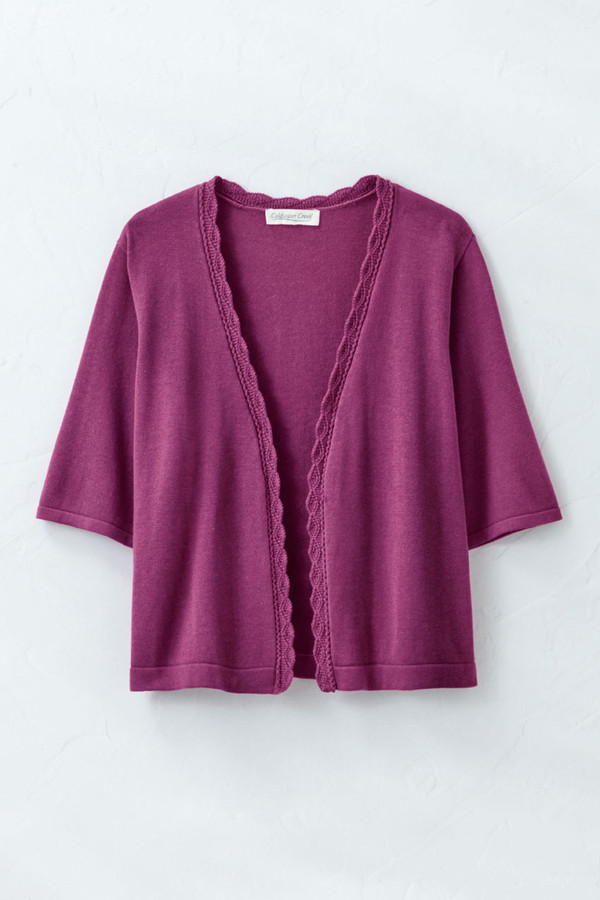 A light-as-air pairing for dresses and more. Soft, smooth sweater shrug features an open front, with crochet-inspired trim.