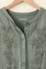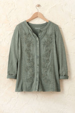 Our vintage-washed tee, uniquely styled with a button front – and beautifully detailed with lace trim and tonal embroidery down the front. Shirred back yoke.