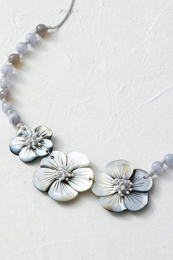 Product Description Luminous mother-of-pearl blossoms catch light on a strand of polished agate beads. Sizing & Fit 27" on adjustable waxed cotton cord Fabric & Care River shell/metal/glass Imported Share Share on Facebook Share on Pinterest Share on Email Print page