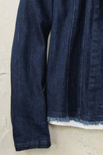 A jean jacket with that lived-in-and-loved look, thanks to raw edge fringe at the neckline, hem and button placket. Collarless silhouette with front and back yokes, princess seams. Imported