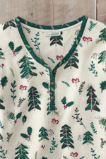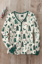 Feel winter-wonderful in this lightweight waffle tee featuring a whimsical print of evergreens and holly. The Henley styling with contrast trim adds visual interest, while the back yoke provides structure and a polished finish. The soft waffle knit texture offers warmth without bulk, making this perfect for layering under jackets or wearing on its own. Pairs beautifully with jeans, corduroys, or leggings for festive yet comfortable everyday style.