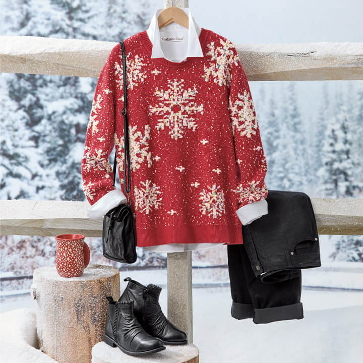 Dress in patterns & textures inspired by snow-dusted mountains & fireside comfort.