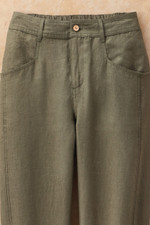 A fresh new shape for summer, in natural European-grown linen. Fun, easy and lightweight, these ankle-length pants feature a wide leg that tapers at the hem, with front seaming details. Back-elastic waist and fly front.