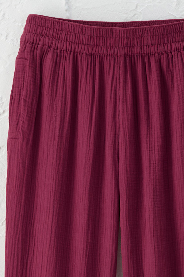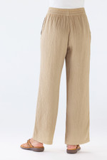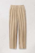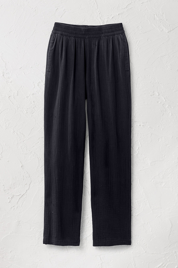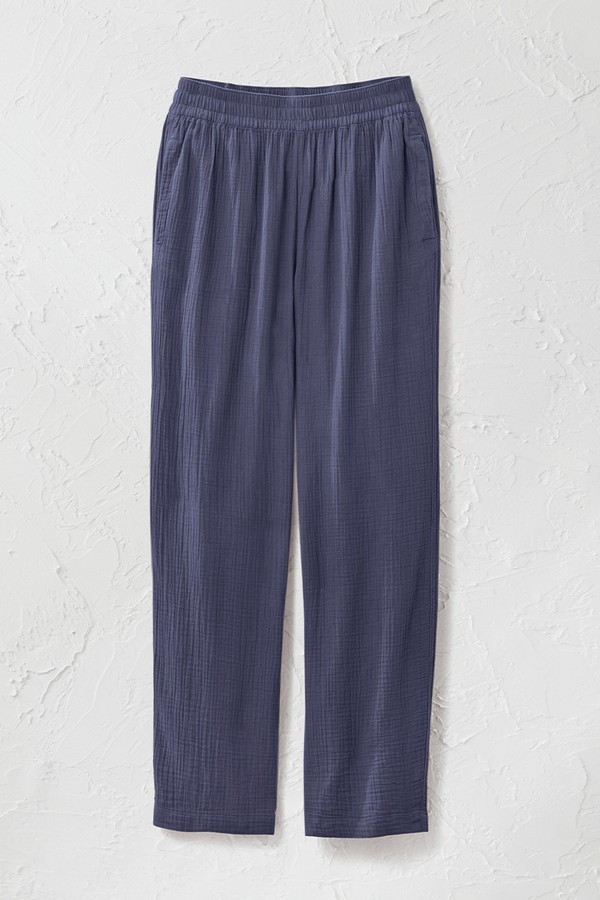 These straight leg pants in soft crinkled double gauze offer lightweight comfort for warm-weather days. The smocked pull-on waist sits comfortably at the waist, while on-seam pockets and a relaxed fit through hips and thighs make these easy-wearing pants great for everything from coffee runs to casual dinners.