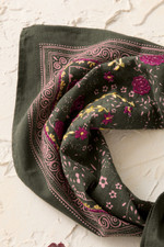 A timeless embroidered neckerchief is artfully printed with delicate woodblock-style botanicals, and brightened with floral embroidery at two corners, adding rich detail to any outfit.