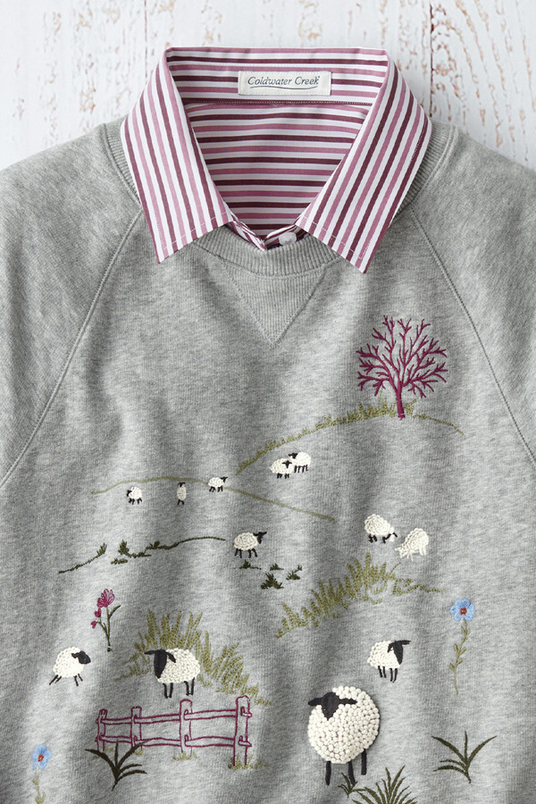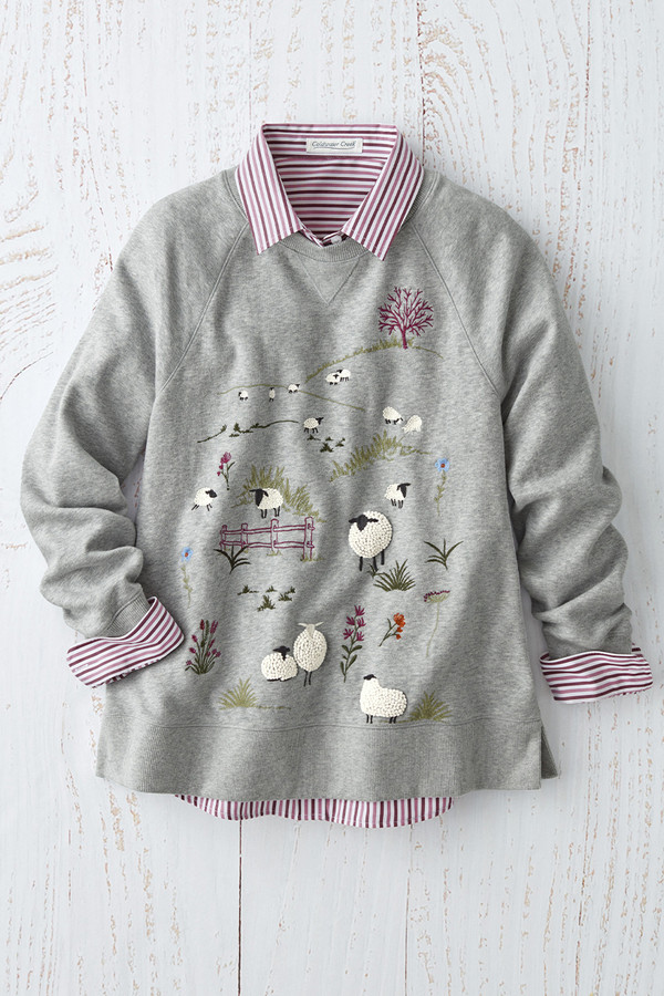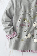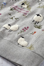 This heathered brushed fleece pullover sweatshirt brings a whimsical twist with a meadow of embroidered sheep on the front—French knots add textural artistry. Raglan sleeves and a wide banded side-slit hem create easy movement and comfortable wear. Perfect for pairing with jeans, joggers, or leggings for casual spring days, farmers market visits, or cozy evenings at home.