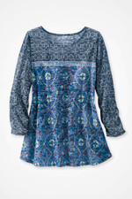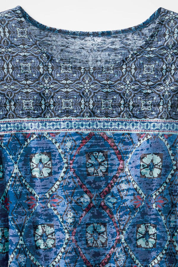 These twin medallion prints catch the eye from a distance, evoking far-away lands and spirited destinations. Look more closely, and you’ll see their myriad colors, blended as perfectly as a mosaic on gently textured burnout for a soft-washed look. Body lined, rounded hem. Made in USA.