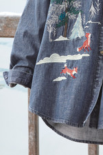 Capture the magic of a winter's eve with this denim shirt featuring embroidered snowflakes and woodland friends—including foxes, evergreens, and a perched snowy owl. The embroidery adds whimsical detail to classic denim styling, while the plain back with pleated yoke keeps the look balanced. Long button-cuff sleeves and a high-low hem create flattering lines that work tucked or untucked. Perfect for holiday gatherings or adding seasonal charm to everyday jeans.