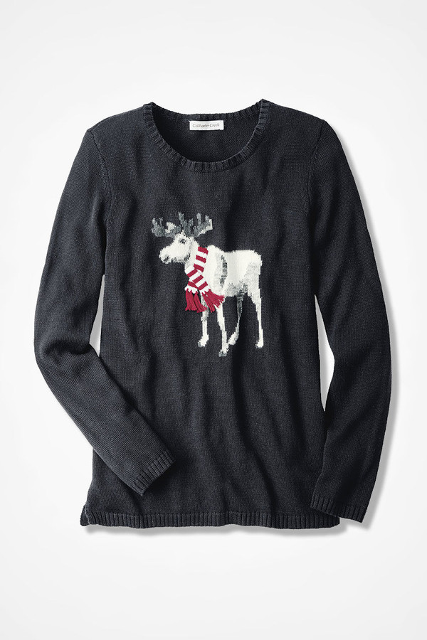 Enjoying a warm welcome, the handsome fellow on this mid-weight sweater evokes a festive air in his red-and-white scarf with real tassel fringe.