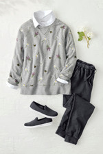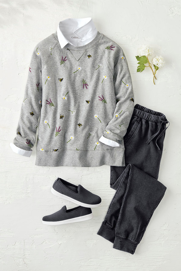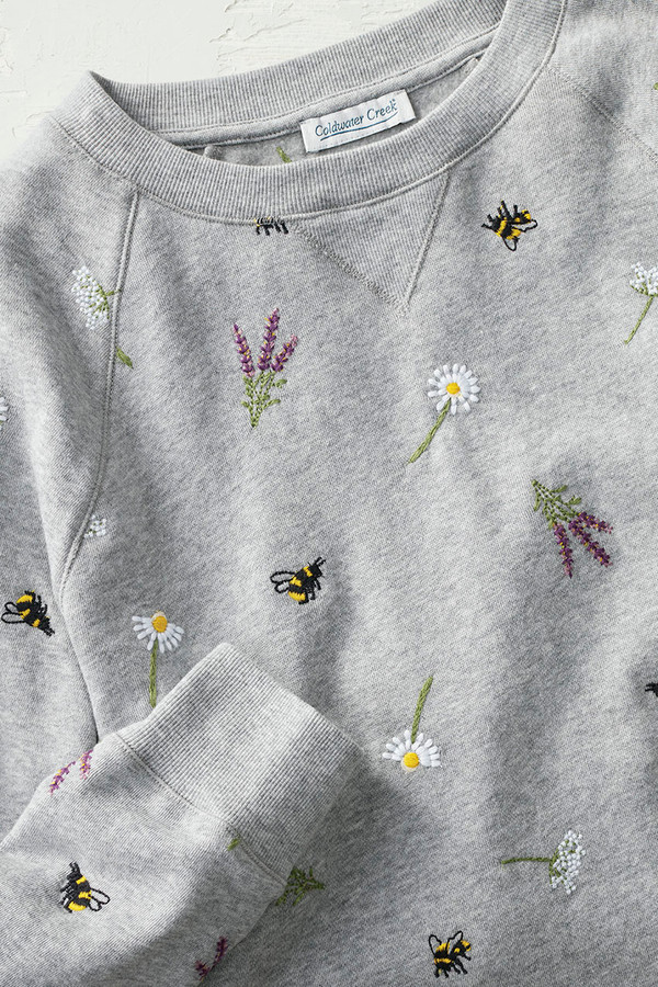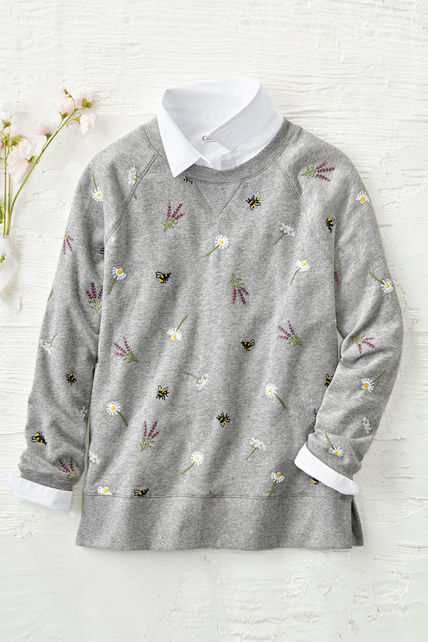 Your favorite fleece, inspired by garden delights. Heathered pullover is embroidered all over with delicate florals and bumblebees. Raglan sleeves, wide banded side-slit hem.