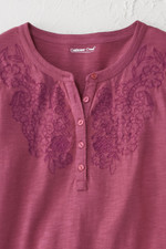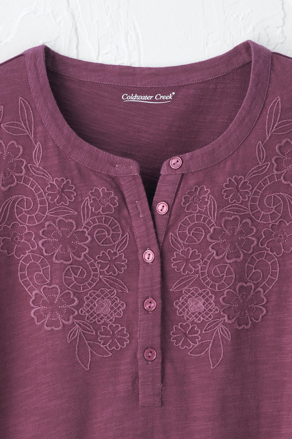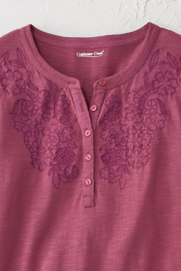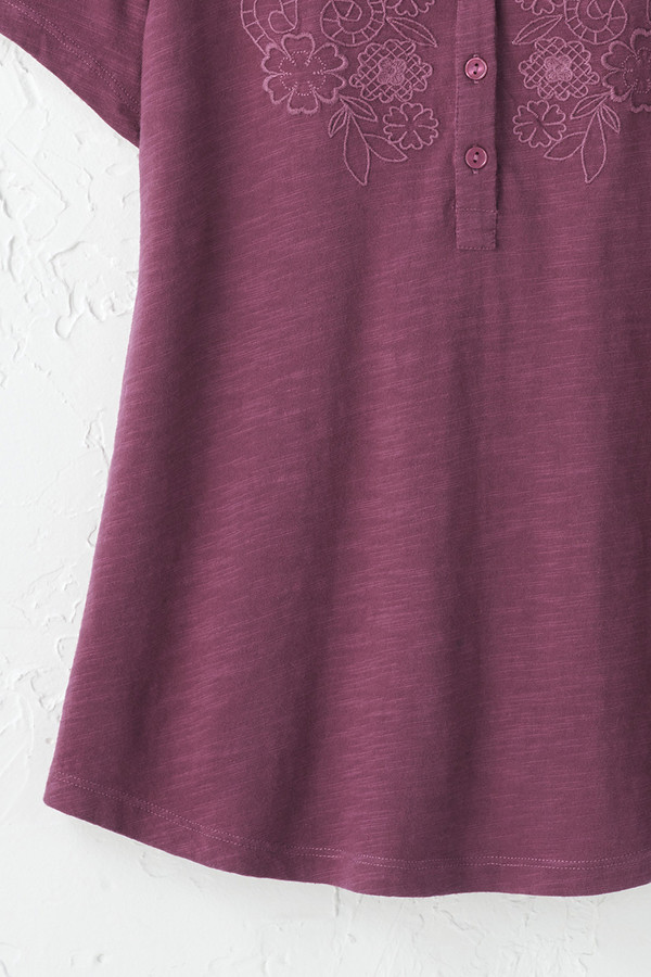 A favorite style made softer and richer, in a lightweight slub knit with a flourish of tonal embroidery.