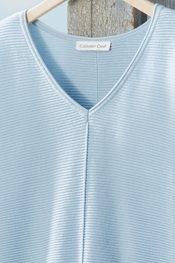 Effortless and versatile, season after season. Our resilient, ribbed-stitch sweater drapes nicely away from the body, casually relaxed with dropped shoulders, exposed seams and jersey-roll pockets. Slight high-low hem, 3/4 sleeves.