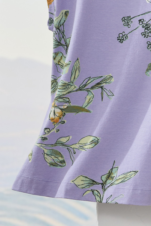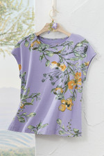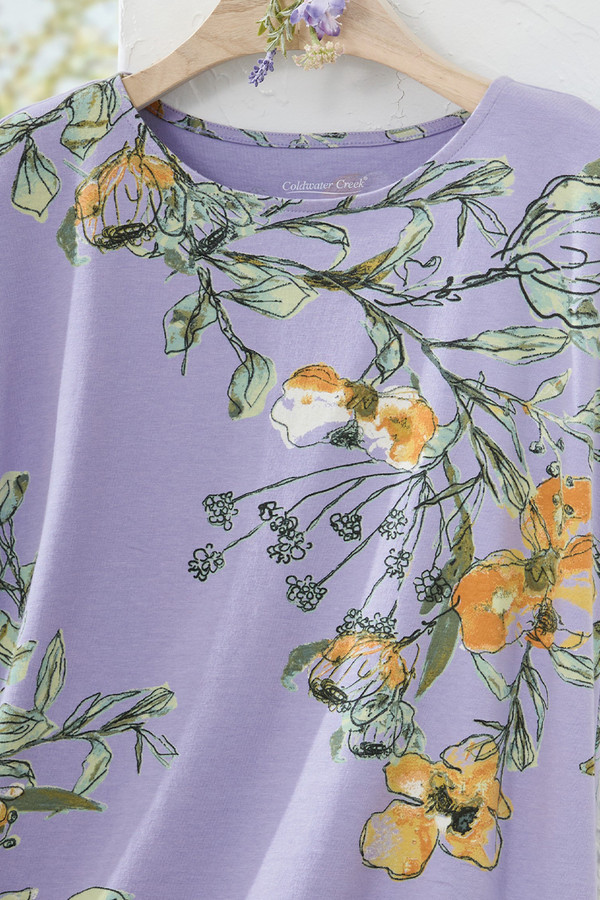 This tee features sketched watercolor florals in an uplifting palette on soft, fluid knit fabric. The slightly boxy style with dolman cap sleeves drapes easily and pairs well with jeans, shorts or casual pants for comfortable everyday wear.