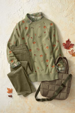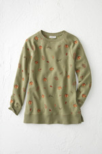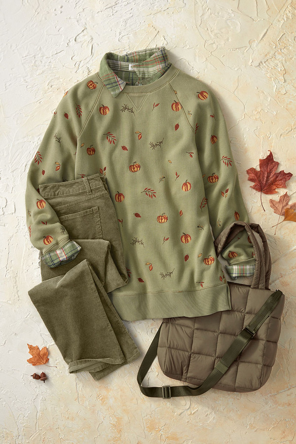 This soft-washed fleece sweatshirt features detailed autumnal pumpkin embroidery with tunic length and on-seam pockets for distinctive seasonal style. Raglan sleeves, side-slit banded hem. Relaxed fit, hits mid thigh.