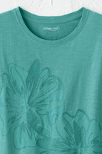 This soft slub tee gives new dimension to florals – in lush, tonal blooms embellished with mesh appliqué and embroidered details. Short sleeves, small side slits.