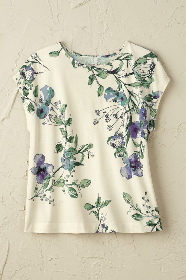 An artfully rendered ink-sketch print in watercolor hues, expressed on a favorite silhouette. Slightly boxy style in a soft, fluid knit.