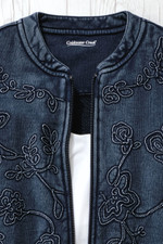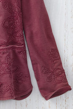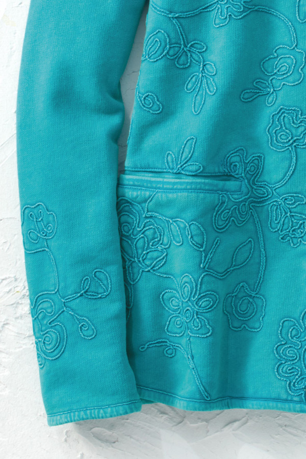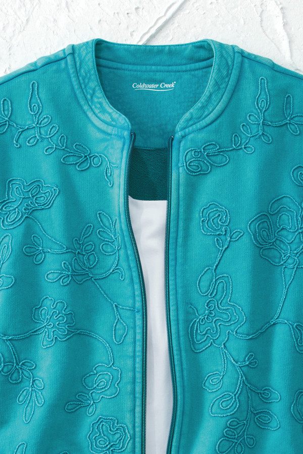 A favorite soft sweatshirt, in a fresh new silhouette. Yarn-dyed cotton terry is accented with tonal embroidery on the front, with a full zip closure, banded collar and welt pockets. Midweight style with solid back, side slits at hem. Relaxed fit, hits mid hip. 100% cotton. Machine wash