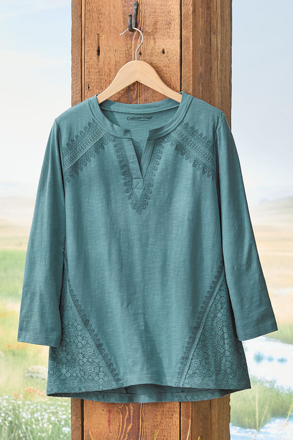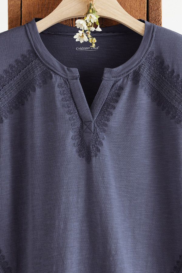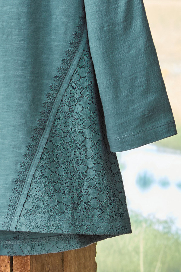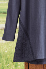 Soft slub knit is complemented by embroidered lace insets and angled seams. Slight A-line shape with split neck, elliptical hem. Lightweight.