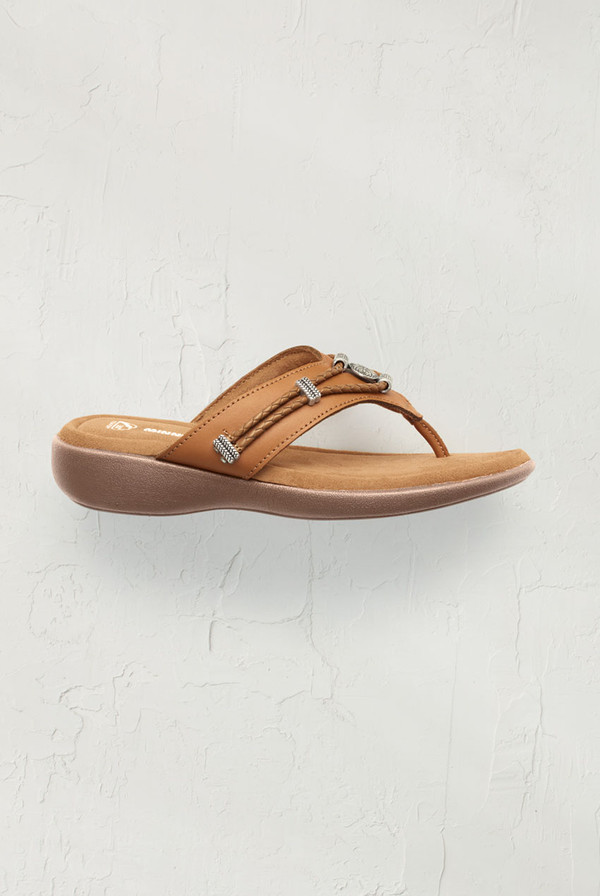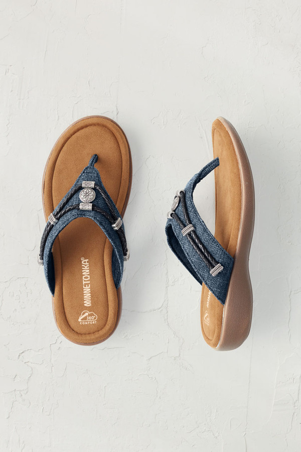 Atfully detailed, Southwest-inspired. Lightweight, slip-on thong sandals feature braided accents with metal medallions. Comfy memory foam cushioned footbeds with soft faux suede lining.