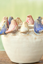 Curious birds circle the edge of this whimsical stoneware planter to see what you're growing. Sturdy and cheerful, this unique reactive glaze planter measures about 5" across x 3 ½" high and holds a 4" pot. No drainage holes. Perfect for succulents, herbs, or small flowering plants on windowsills, desks, or shelves.