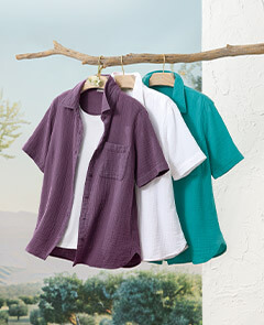 Our pure cotton double gauze shirt is designed with flutter sleeves for flowy ease and movement. Breathable and lightly textured, with a shirred back yoke, bust darts and side-slit shirttail hem.