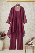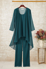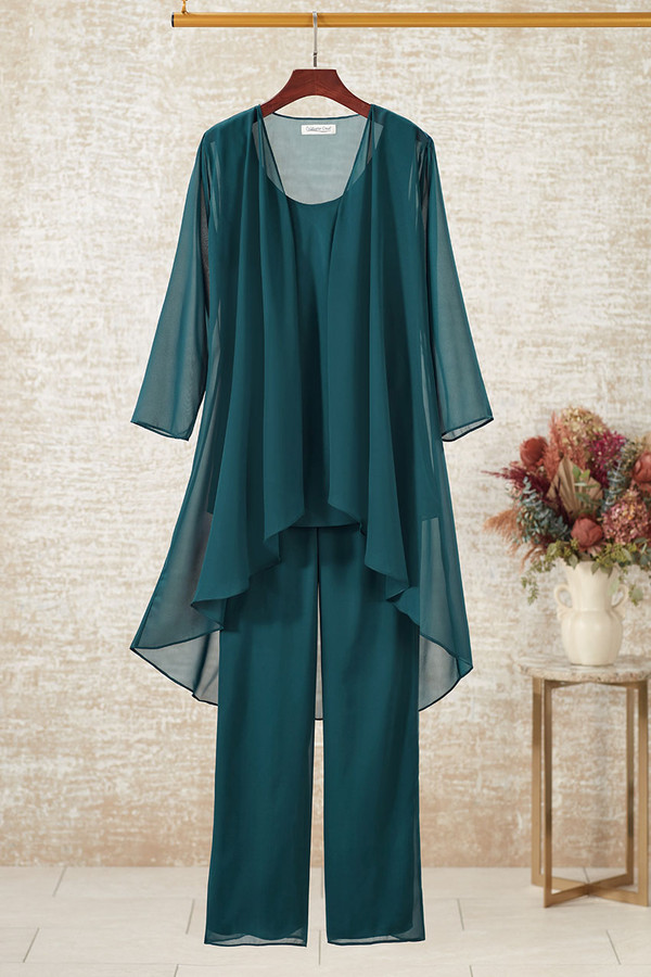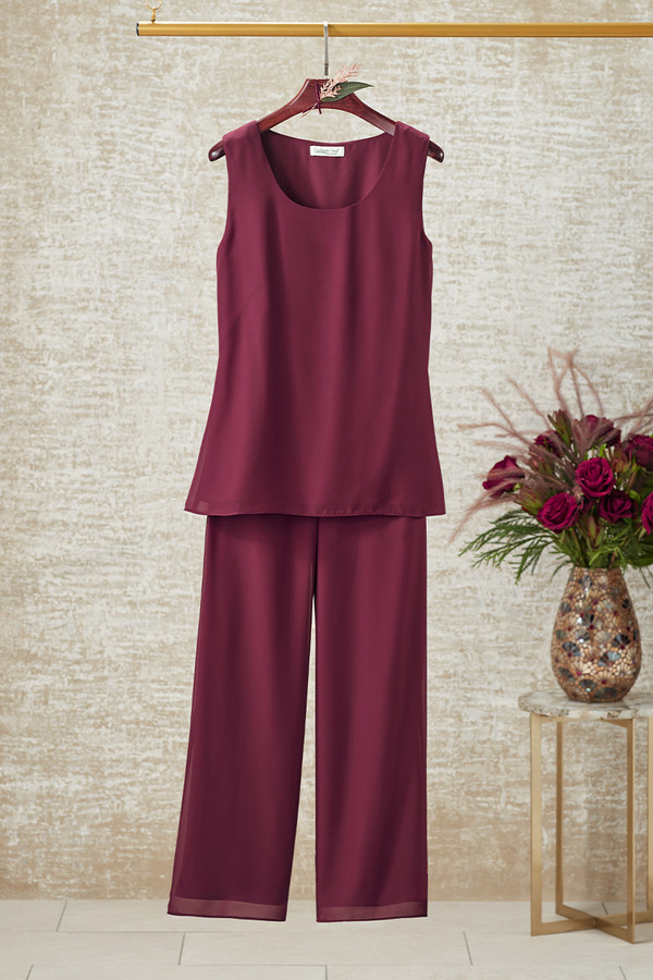 A striking impression, with so little effort. This 3-piece pants set flows gracefully in sheer, lined georgette. Slightly shaped tank has a gently curved hem. Ankle-length pants.