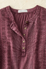 This vintage-washed blouse is richly detailed in tonal embroidery and lace appliqués lending distinctive, artisanal appeal and depth of color. Popover style with partial button placket, side slits and long button-cuff sleeves.