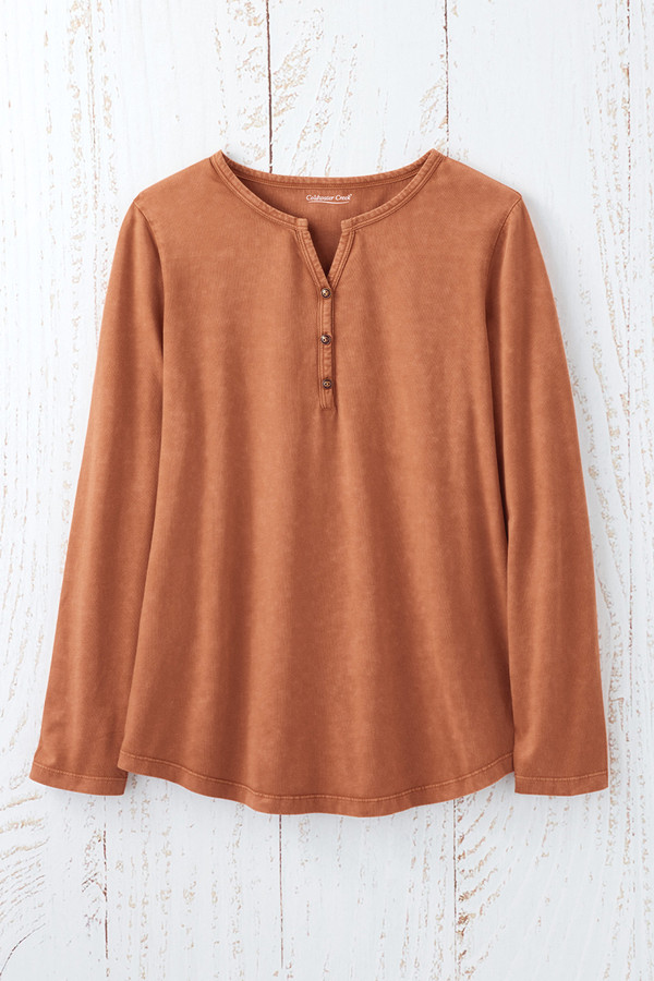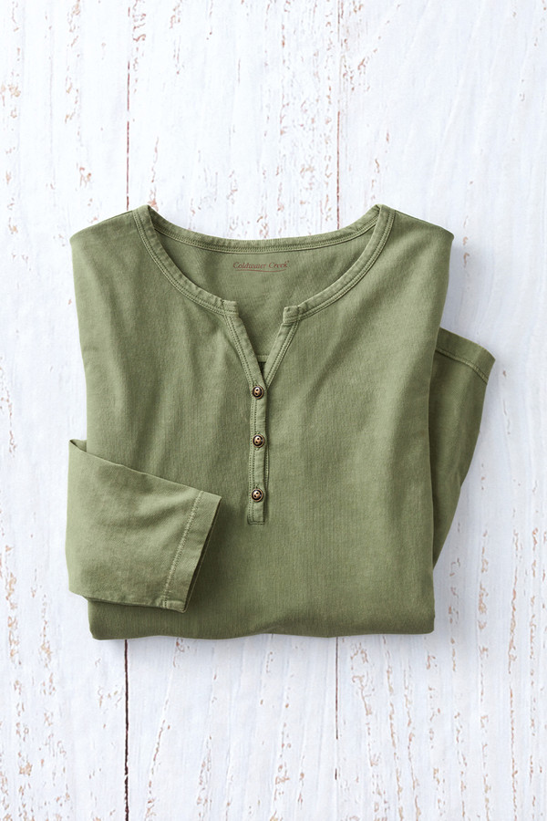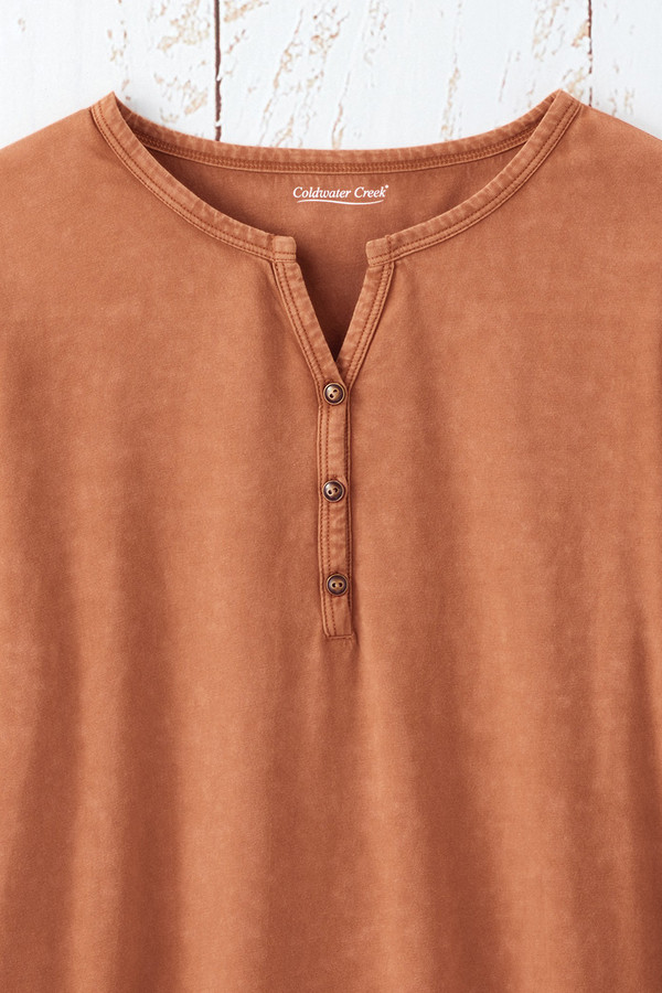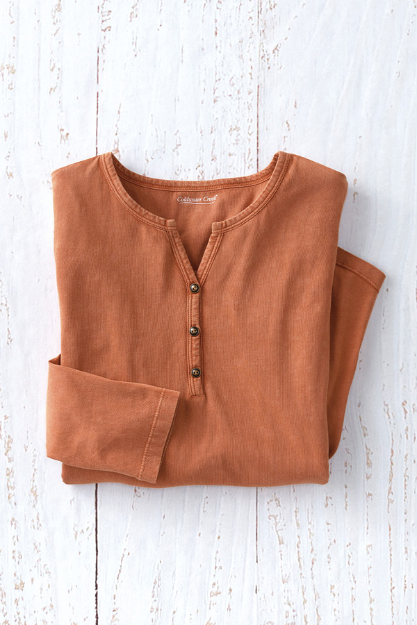 This Vintage-Wash Solid Long-Sleeve Henley is a favorite style, in our special wash that creates subtle color variations – so each tee is unique. Comfortable and breathable in lightweight cotton knit, with metal buttons, shirred back yoke and rounded hem.