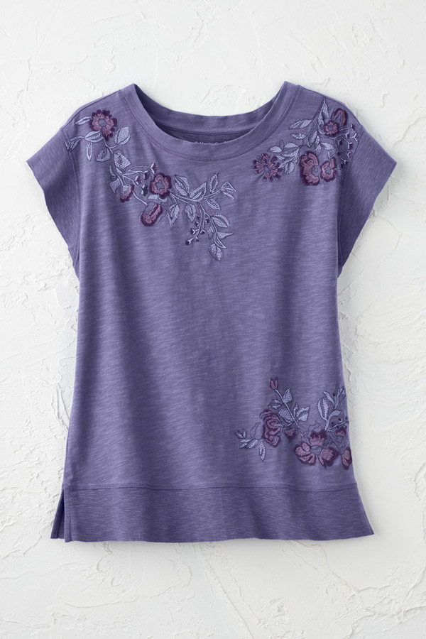 Casual comfort, with extra-special touches. Beautiful floral embroidery and raw edges add an artful element to this slub knit top. Dropped shoulders with cap sleeves, ribbed side-slit hem. Imported.