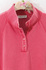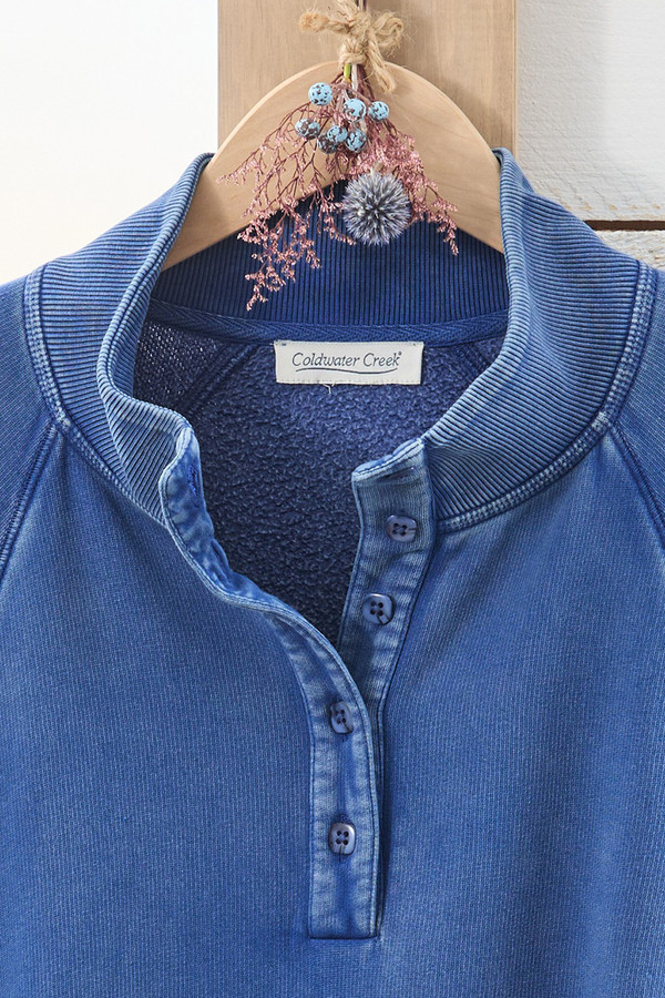 This midweight fleece pullover features a mockneck and raglan sleeves for comfortable movement. Side rib panels provide a sportier silhouette, while welt pockets add convenience, and the button closure at the neckline gives you styling options. Perfect for weekends with your favorite jeans or leggings. The relaxed fit hits at your low hip, creating an easy silhouette.