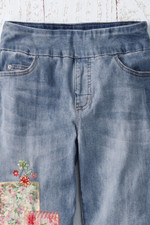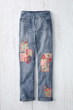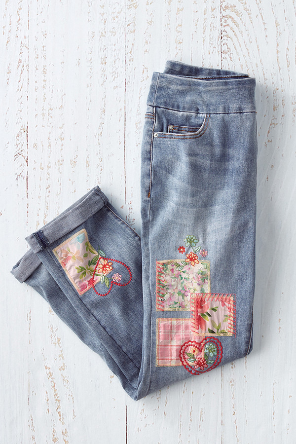These comfortable stretch denim jeans bring patchwork flair you'll love with whimsical embroidery and appliquéd patches adding special character. The pull-on waist eliminates gapping and ensures comfortable all-day wear, while the fitted-through-hips-and-thighs silhouette flatters without feeling restrictive. High rise sits at the waist for coverage, and the straight leg with 14" opening works with everything from sneakers to boots. Classic 5-pocket styling adds authentic denim details.