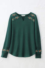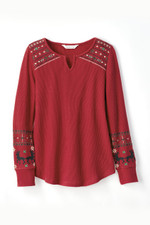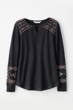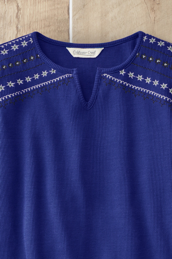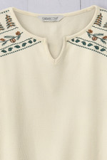 Alpine motifs give this light, waffle knit tee a folkloric feel. Embroidered at the shoulders and sleeves, with a split neck and curved hem.